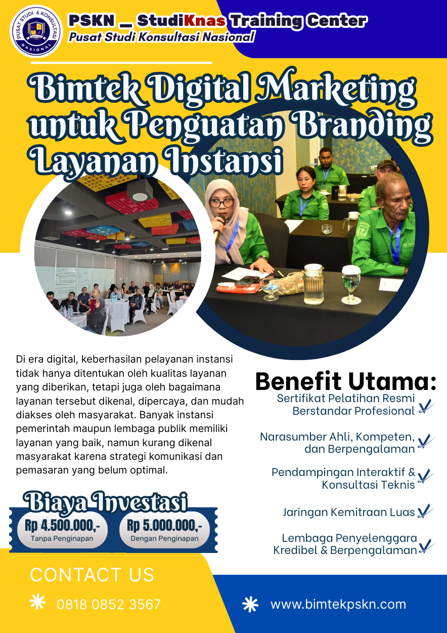 Digital marketing kini menjadi strategi penting dalam membangun citra positif instansi sekaligus memperkuat branding layanan kepada masyarakat. Oleh karena itu, program Bimbingan Teknis (Bimtek) Digital Marketing untuk Penguatan Branding Layanan Instansi menjadi kebutuhan penting bagi organisasi pelayanan publik modern.