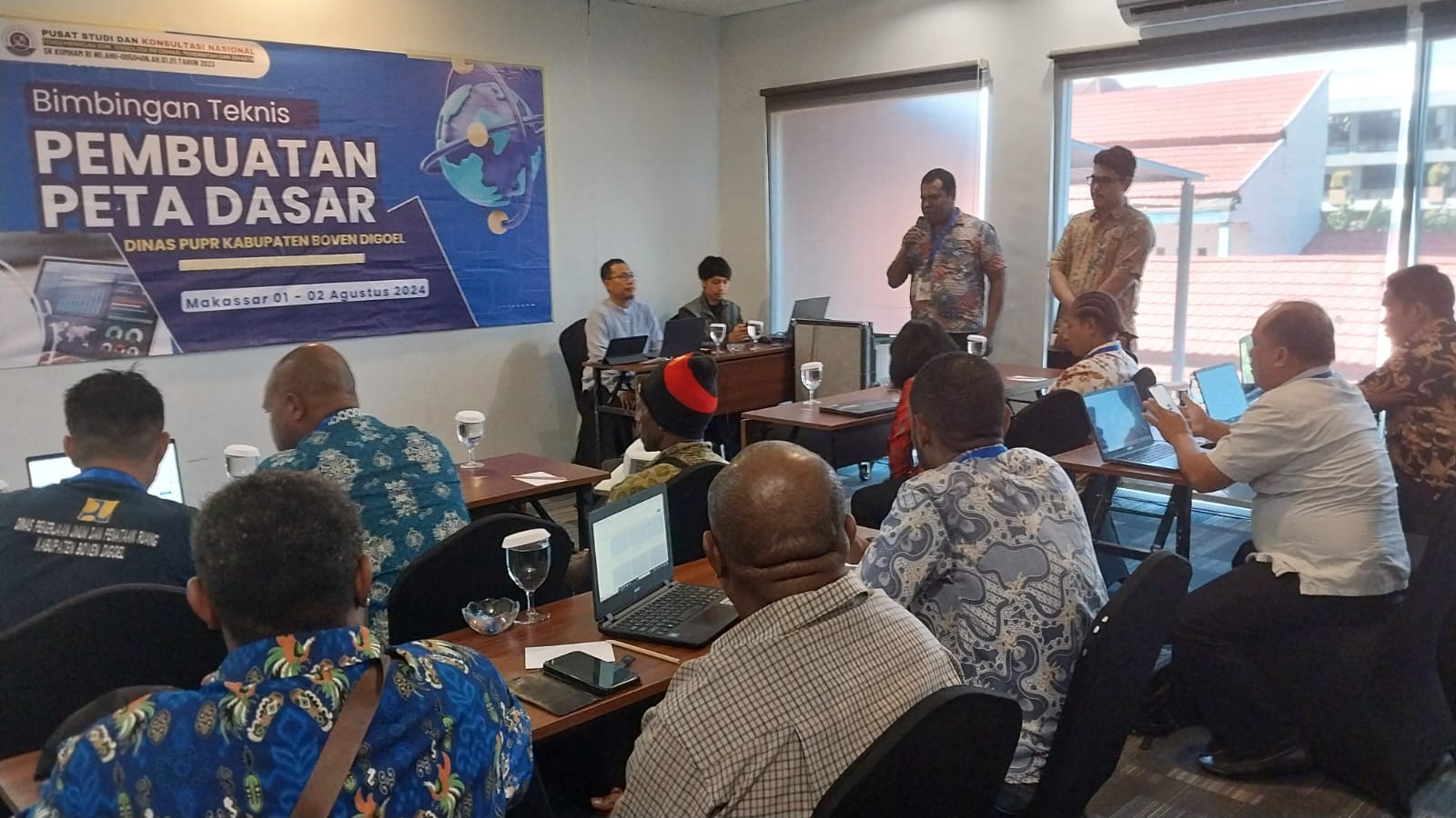 Dinas PUPR Kabupaten Boven Digoel Mengikuti Bimbingan Teknis Bimbingan Teknis Pembuatan Peta Dasar yang di selenggarakan oleh Pusat Studi & Konsultasi Nasional pada tanggal 01-02 Agustus 2024 di KHAS Makassar Hotel Jl. Daeng Tompo No.28-36, Maloku, Kec. Ujung Pandang, Kota Makassar, Sulawesi Selatan 90112.
