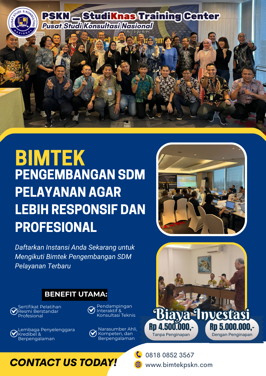 Di era pelayanan modern, masyarakat menuntut pelayanan yang cepat, transparan, mudah, dan ramah. Oleh sebab itu, instansi pemerintah maupun organisasi pelayanan publik harus secara konsisten meningkatkan kompetensi SDM melalui pelatihan yang tepat, salah satunya melalui Bimbingan Teknis (Bimtek) Pengembangan SDM Pelayanan.