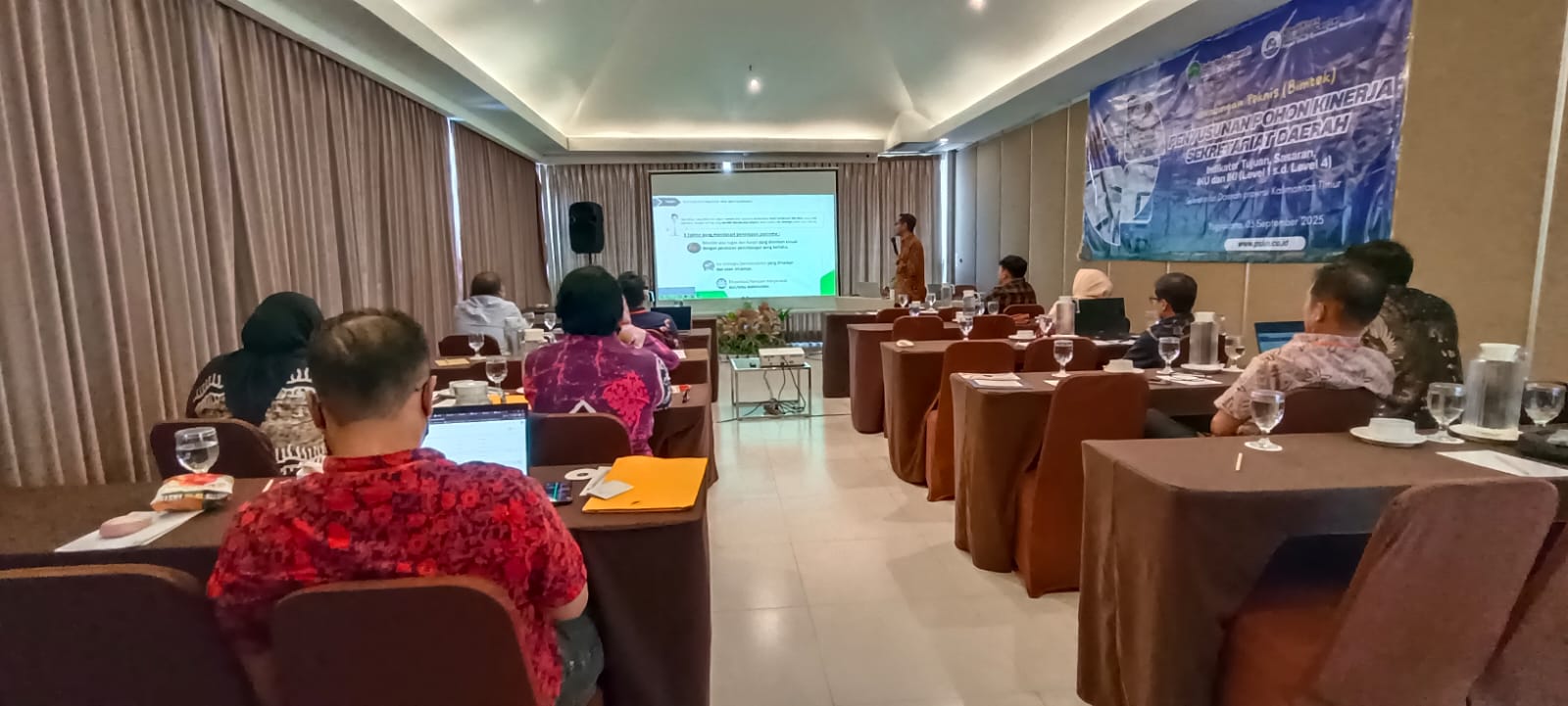 Dalam rangka mewujudkan tata kelola pemerintahan yang efektif, akuntabel, dan berorientasi hasil, setiap perangkat daerah diwajibkan menyusun Pohon Kinerja. Pohon Kinerja merupakan turunan langsung dari Rencana Pembangunan Jangka Menengah Daerah (RPJMD), Rencana Strategis (Renstra), dan Rencana Kinerja Tahunan (RKT). Pohon Kinerja berfungsi sebagai peta hubungan hierarkis antara Tujuan → Sasaran → Indikator Kinerja Utama (IKU) → Indikator Kinerja Individu (IKI) mulai dari Level 1 (pimpinan) hingga Level 4 (staf pelaksana). Banyak Sekretariat Daerah menghadapi kendala dalam menyusun pohon kinerja yang sistematis, terukur, dan terintegrasi dengan sistem perencanaan dan pelaporan berbasis kinerja. Oleh karena itu, diperlukan Bimbingan Teknis (Bimtek) yang memberikan pemahaman konseptual sekaligus praktik penyusunan pohon kinerja.