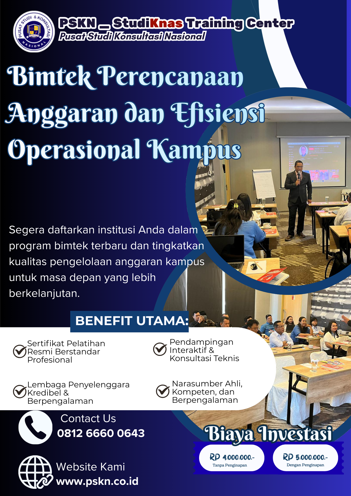 Melalui Bimtek Perencanaan Anggaran dan Efisiensi Operasional Kampus, institusi pendidikan dapat meningkatkan kapasitas pengelolaan keuangan secara profesional, terukur, dan berorientasi hasil. Program ini dirancang untuk membantu pimpinan kampus, unit keuangan, serta pengelola program memahami strategi penyusunan anggaran modern yang selaras dengan regulasi nasional.