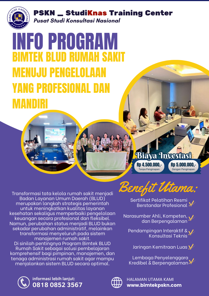 Hubungi kami sekarang untuk mendapatkan jadwal Program Bimtek BLUD Rumah Sakit terbaik bagi institusi Anda.