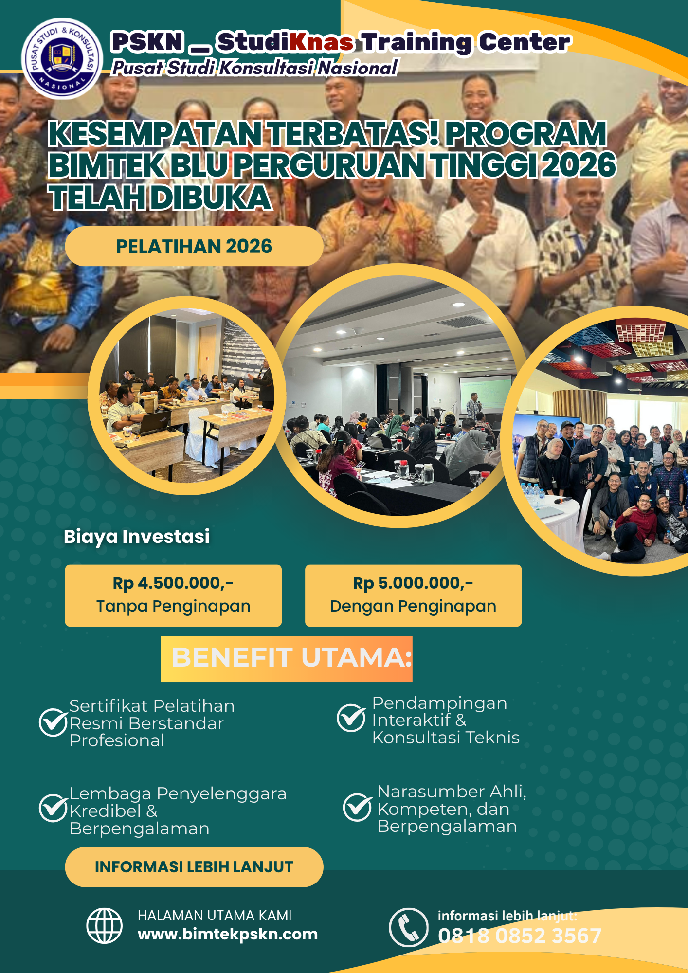 Segera daftarkan tim keuangan terbaik Anda pada Program Bimtek BLU Perguruan Tinggi 2026 dan wujudkan tata kelola kampus yang profesional, modern, dan berdaya saing tinggi.