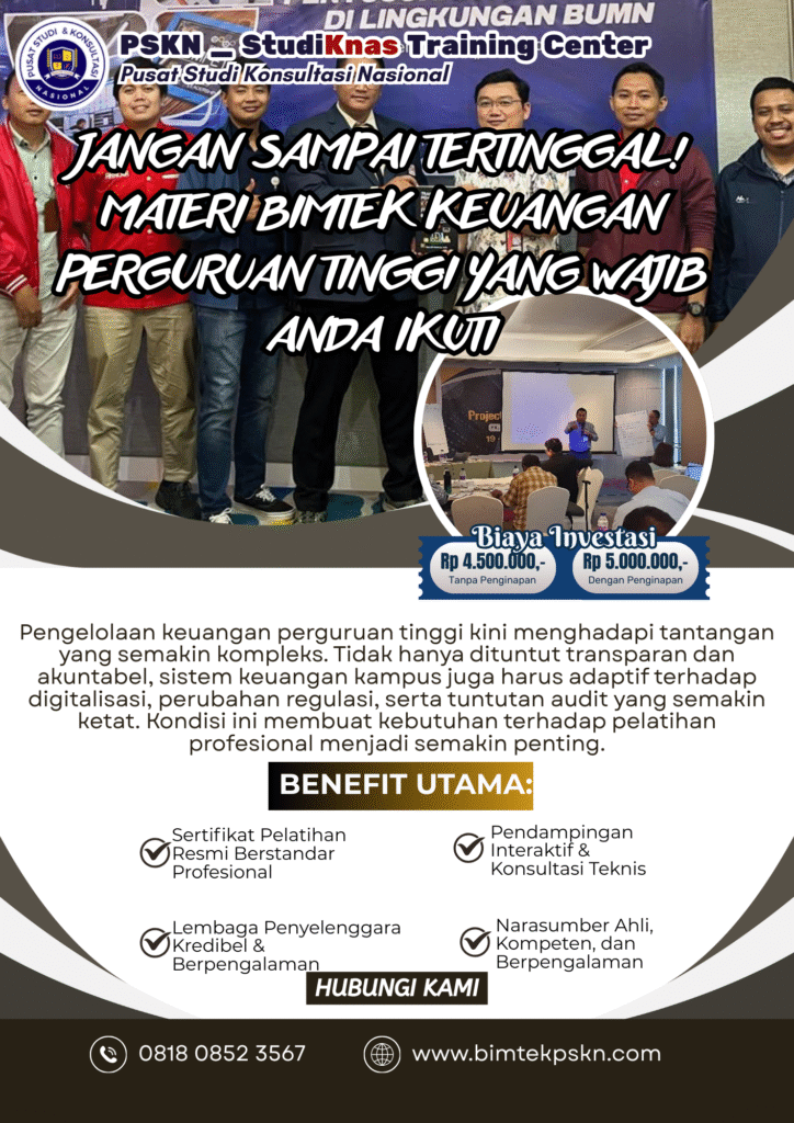 03 Feb Pelatihan Perguruan Tinggi Materi Bimtek Keuangan Perguruan Tinggi Terbaru 2026 yang Wajib Diikuti Pengelola Kampus Ditulis oleh Bimtek PSKN 3 Februari 2026 Pengelolaan keuangan perguruan tinggi kini menghadapi tantangan yang semakin kompleks. Tidak hanya d... Lanjutkan membaca