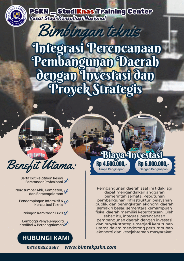 02 Feb Bimtek Perencanaan Bimtek Integrasi Perencanaan Pembangunan Daerah dengan Investasi dan Proyek Strategis Ditulis oleh Bimtek PSKN 2 Februari 2026 Pembangunan daerah saat ini tidak lagi dapat mengandalkan anggaran pemerintah semata. Kebutuhan pemb... Lanjutkan membaca